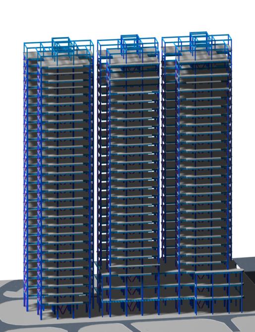 整個(gè)項目分為三個(gè)單元,1單元地下一層,地上27層;2單元和3單元地下一層,地上26層;采用鋼框架-中心支撐結構體系。