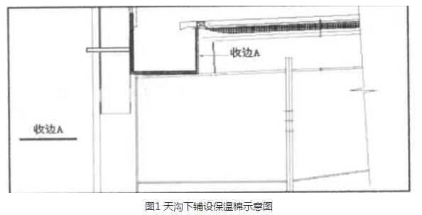 在寒冷地區,冬季室內外溫差大,內天溝下會(huì )出現冷凝水,因此要求天溝下鋪設保溫棉,在施工中可采用圖1所示做法。保溫棉通過(guò)吊掛天溝的檁條固定。同時(shí),在天溝底部加一收邊(一般采用彩鋼板),如圖中收邊A,既美觀(guān)又可以固定保溫棉。