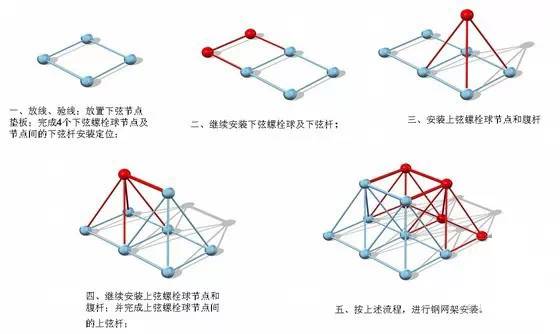 鋼網(wǎng)架根據其結構型式和施工條件的不同,可選用高空拼裝法,整體安裝法或高空滑移法進(jìn)行安裝。