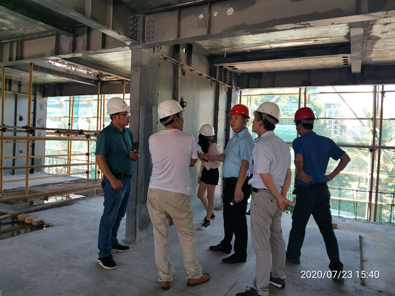 陳經(jīng)理首先帶領(lǐng)考察團參觀(guān)20#樓首層及二層,詳細介紹了本項目采用的專(zhuān)利-隱式鋼框架結構體系,具備鋼柱無(wú)內隔板、柱芯灌注自密實(shí)砼、鋼柱外包防腐防火等優(yōu)點(diǎn)。隨后考察團就桁架樓承板的安裝流程、主體安裝進(jìn)度以及樣板間的砌筑工藝、ALC墻板安裝等節點(diǎn)工藝進(jìn)行深入討論。