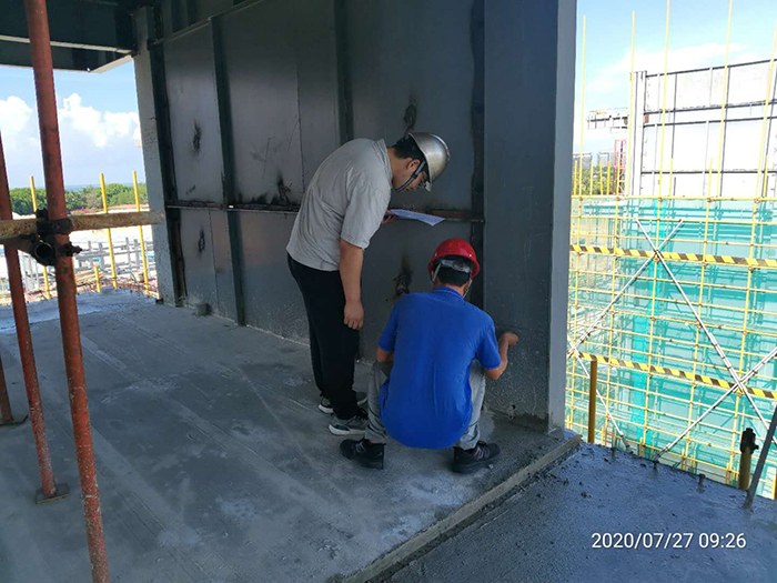 7月27日上午,瑞捷第三方檢測第三次到綠城藍灣小鎮香樟苑項目,針對現場(chǎng)的質(zhì)量風(fēng)險及實(shí)測實(shí)量進(jìn)行過(guò)程評估,主要檢查現場(chǎng)鋼結構鋼柱、鋼梁垂直度與對接焊縫,防腐厚度,表面觀(guān)感等環(huán)節。