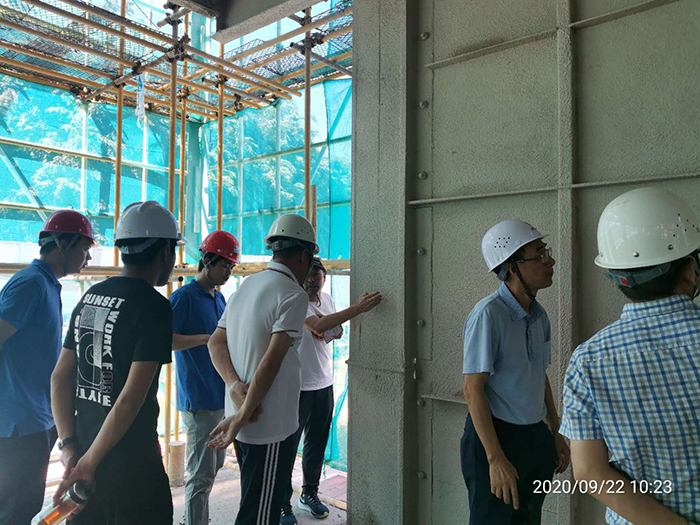 首先由陳經(jīng)理在會(huì )議室進(jìn)行了項目情況的簡(jiǎn)單介紹,從項目整體建設到現場(chǎng)施工情況,以及隱式鋼框架結構體系在本項目中凸顯的優(yōu)勢。然后,項目部人員陪同考察團現場(chǎng)實(shí)地參觀(guān),直觀(guān)調研整體在建工程,包括鋼結構裝配式住宅的施工工期、施工順序、各工序之間的關(guān)系協(xié)調等主要環(huán)節,多方面了解本工程的施工經(jīng)驗。接著(zhù)參觀(guān)了室外樣板展示區、樣板間,對鋼結構的防腐防火處理及材料選用進(jìn)行了細致討論,并就柱內混凝土澆筑問(wèn)題、隔音保溫隔熱處理等施工工藝進(jìn)行交流探討。