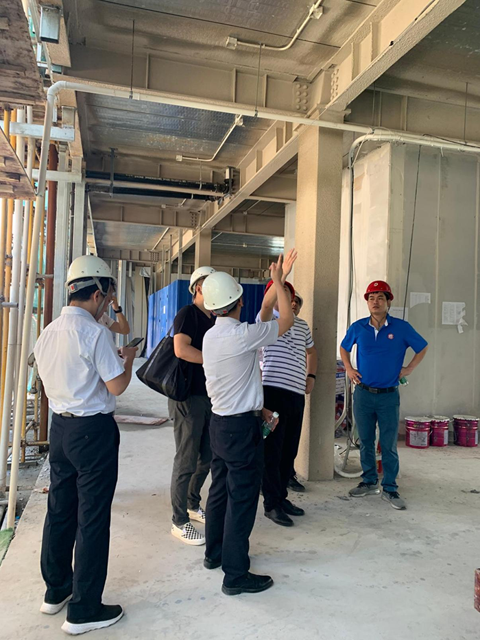 2021年5月18日下午,考察團到融創(chuàng )(碧桂園)萬(wàn)寧海南臻園項目現場(chǎng)考察,詳細了解了結構形式、墻體材料、施工工藝、施工速度、鋼結構使用的鋼柱、鋼梁原材料供應情況、寬鋼管柱的加工、采購流程及工藝等方面,重點(diǎn)了解了隱式框架節點(diǎn)。李秘書(shū)長(cháng)提出:鋼結構建筑可以通過(guò)提高材質(zhì)等級,將構件截面尺寸、厚度進(jìn)一步減小,滿(mǎn)足住宅建筑適應性同時(shí)給建筑更大使用空間;并提出住宅鋼結構的構件規格應該進(jìn)行標準化設計,方便成品型材采購及智能制造。