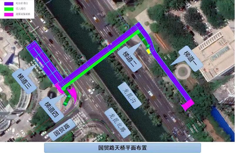 國貿路天橋項目位于國貿路與龍昆北路交叉口北側,主橋長(cháng)約88.2米,橋梁寬7至9米,梯道和坡道總長(cháng)約186米,鋼結構工程量700噸。橋梁靠南一側設有觀(guān)景平臺,設計靈感源于海之珠貝,曲線(xiàn)靈動(dòng)流暢,溫潤宜人,結合良好的景觀(guān)視野形成休憩觀(guān)景的下沉式坐階,與環(huán)境完美契合。