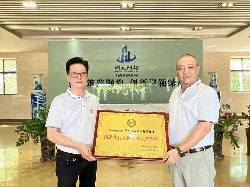 最后海南省溫州商會(huì )會(huì )長(cháng)劉漢博代表商會(huì )特授予我司“鋼結構行業(yè)海南省頭部企業(yè)”稱(chēng)號,走訪(fǎng)活動(dòng)圓滿(mǎn)結束。對此稱(chēng)號我司表示榮幸之至,在公司成立至今我司曾獲得中國建筑金屬結構協(xié)會(huì )頒發(fā)的“中國鋼結構金獎”、“中國建筑金屬結構協(xié)會(huì )科學(xué)技術(shù)一等獎”等榮譽(yù),也是國家級裝配式建筑生產(chǎn)基地,這是肯定,也是激勵,浙大鋼構必將砥礪前行,堅持自身特色,抓住機遇,繼續穩步、持續、健康的發(fā)展。