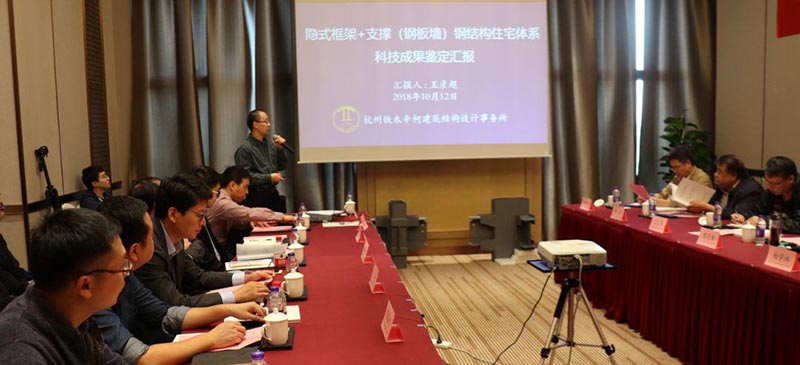 2018年10月12日,浙江省技術(shù)經(jīng)紀人協(xié)會(huì )在杭州組織召開(kāi)了由鐵木辛柯研發(fā)的“隱式框架+支撐(鋼板墻)鋼結構住宅體系”科技成果鑒定會(huì ),鑒定會(huì )由清華大學(xué)郭彥林教授、全國勘察設計大師王立軍教授級高工、浙江省院總工楊學(xué)林教授級高工、蘇州科技大學(xué)顧強教授、江蘇省院總工金如元研究員、浙大院總工肖志斌研究員、四川省院常務(wù)副總工趙仕興教授級高工等多位知名專(zhuān)家學(xué)者組成鑒定專(zhuān)家委員會(huì )。鑒定專(zhuān)家聽(tīng)取了研發(fā)總結、試驗檢測、用戶(hù)意見(jiàn)和科技查新等報告,查看了樣品資料,經(jīng)過(guò)深入質(zhì)詢(xún)和討論,最后一致認為“研究成果總體達到國際先進(jìn)水平,其中寬鋼管混凝土柱的承載力計算方法、節點(diǎn)構造及設計達到國際領(lǐng)先水平”,同意通過(guò)鑒定。